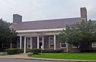 At that time the school consisted of its current central block, a single-story seven-bay rectangle in a randomly coursed ashlar pattern with a slate-shingled gable roof pierced by two brick chimneys. It stood in the middle of a 7-acre (2.8 ha) lot. Smaller wings project from all sides save the west, still the building's main entrance. It opens to a classic Colonial Revival center-hall plan, with much of the original finishes remaining.[2]