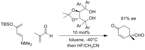 Similarly, negative charge can develop in cycloaddition reactions such as the Diels-Alder reaction, when the partners are appropriately substituted. As a representative example, Rawal and coworkers developed a chiral catalyst based on α,α,α',α'-tetraaryl-2,2-disubstituted 1,3-dioxolane-4,5-dimethanol (TADDOL) that could catalyze Diels-Alder reactions. In the following example, the reaction with a highly electron-rich diene and an electron-poor dienophile is thought to develop significant negative charge on the enal fragment, and is the transition state is stabilized by increased hydrogen bonding to the TADDOL (Ar = 1-naphthyl).[10]