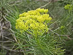 This slender and single branched shrub grows up to 1.5 m (4.9 ft) tall.[4] The stem splits into a few sparse branches from about halfway up the plant.[5] The small thread-like leaves roll outward and downward.[4]