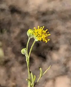 Hymenopappus flavescens is a biennial herb up to 90 cm (3 feet) tall. It produces 15-100 flower heads per stem, each head with 20–40 yellow disc flowers but no ray flowers.[6]