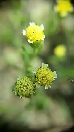 Hymenoxys texana is an annual herb with delicate reddish or purplish stems growing only 10 or 15 centimeters (4-6 inches) tall. The leaves have rubbery, glandular blades which may be simple or divided into lobes, particularly at mid-stem. The inflorescence is a solitary flower head or an open cluster of several heads. Each head is under a centimeter wide and has 6 to 8 yellow ray florets each 2 or 3 millimeters long.[3] The ray florets are often tucked behind the phyllaries. The center of the head has 30–75 tiny disc florets.[4]