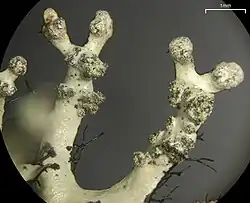 Close up of terminal branches showing truncate lobe tips, powdery soredia, and rhizines.