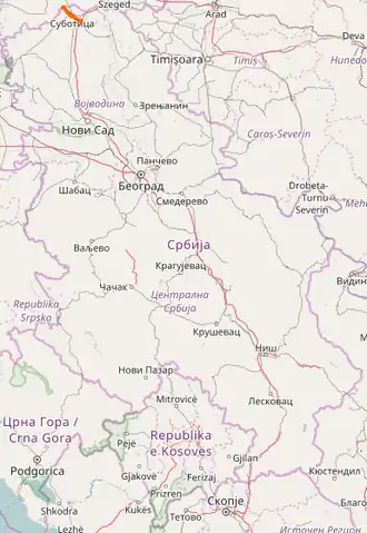 01100 11.125 km (6.913 mi) 11.125 km (6.913 mi) Hungary – Serbia border (Kelebija) – Subotica (Sombor road)