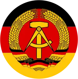 Logo of IFA Wartburg, a circular version of the Flag of East Germany with slight modifications.