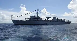 INS Darshak in 2016 completed the hydrographic survey of Tanga Port, Tanzania coast for the Government of Tanzania. This survey work was of particular importance for the country's government due to upcoming oil pipeline being laid at the port from Uganda.[2] In late 2016 the ship also carried out survey work off the waters of Mauritius to prepare two new charts of the Mauritian waters as per charting scheme agreed the two governments. The survey was useful for the tourism industry based in northern Mauritius. Areas off Mon Choisy, Grand Bay and other smaller islands in the north were surveyed comprehensively. Also survey data was collected for aquaculture site off Anse La Raie and deep sea transacts for scientific research at request of Mauritius Oceanography Institute. The survey is also expected to help in Deep Ocean Water Application Projects done on request of Continental Shelf Department of Prime Minister's Office.[3] Earlier in 2015, INS Darshak conducted hydrographic survey in Seychelles for a period of 1 month concentrating off the coast of Port Victoria and in nearby areas covering the north east of the island of Mahé, Seychelles.[4] On 3 March 2017 the ship was deployed to Sri Lanka for a two-month-long hydrographic survey trip in collaboration with Sri Lanka Navy. During the trip Sri Lanka Navy personnel joined their counterparts on the ship to undertake advanced hydrographic practices. The ship also made port calls to Colombo and Galle.[5]