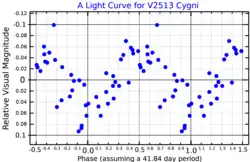In 2006, Vera P. Arkhipova et al. announced that IRAS 19475+3119 is a variable star.[8] It was given its variable star designation, V2513 Cygni, in 2013.[9] The star varies from about magnitude 9.33 to 9.50. A primary period of 41 days has been determined, but a slightly shorter secondary period leads to long beats causing variations in the amplitude and apparent period from year to year. The variations are caused by stellar pulsations, with the star being brightest when it is hottest. The temperature varies by up to 400 K.[10]