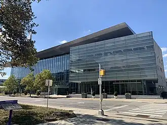 The IU Indianapolis Campus Center is located at the geographic center of the campus on the corner of W. Michigan Street and University Boulevard. The building is the focal point of the campus, with a large distinguishable modern clock tower. Exterior materials include limestone at the Vermont and Michigan Street facades, with large expanses of glass facing University Boulevard. Brick and metal were used for subsidiary facades and structural detailing.[14] The main façade is a four-story glass curtain wall. A three-story glass cube projects forward from the main façade at the northeast corner which contains the campus bookstore. The southeast corner contains a concrete and steel tower, which serves as a clock tower.[15]