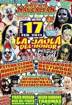 La Jaula del Honor (Spanish for "The Cage of Honor") was a major professional wrestling event produced by the International Wrestling Revolution Group (IWRG), that took place on February 17, 2011, at Arena Naucalpan in Naucalpan, State of Mexico. The title of the event, La Jaula del Honor, referred to the main event match, a steel cage match that involved three, three-man teams contested under elimination rules. A wrestler would "escape" the match by climbing up the side of the cage and out, with the last remaining wrestler in the cage, along with his team mates. being deemed the loser of the match. The three factions in the main event represented three different professional wrestling promotions, IWRG represented by Los Oficiales (Oficial 911, Oficial AK-47 and Oficial Fierro), Perros del Mal, represented by Bestia 666, Damian 666 and Halloween and Asistencia Asesoria y Administracion (AAA) represented by Los Psycho Circus (Monster Clown, Murder Clown and Psycho Clown). In all cases the "inter-promotional rivalry" was based on storylines and not actual animosity.
