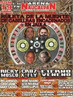 Ruleta de la Muerte (April 2015) (Spanish for "Roulette of Death") was an annual professional wrestling major event produced and scripted by the Mexican professional wrestling promotion International Wrestling Revolution Group (IWRG), which took place on May 5, 2015 in Arena Naucalpan, Naucalpan, State of Mexico, Mexico. The event was named after the Maine vent match, the Ruleta de la Muerte, a steel cage match where all four of the competitors were chained together. The last man in the cage would be forced to have his hair shaved off as a result. The four competitors risking their hair in the match were Ricky Cruz, Eterno, Veneno and X-Fly. The show featured four additional matches.