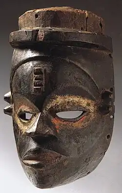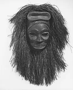 The masks of the Ekpo societies were used to elicit fear and execute social control.[19] The most common type of mask is one made for the face with waist-length raffia attached. The effect of the masks and their intimidating quality is part of what gives them their power, in addition to the long history of the Ekpo. To put on an Ekpo mask is to surrender earthly identity and assume an ancestral one. Masks used may be ones owned by deceased ancestors, ones made to look like ancestors, or ones made to resemble to village heroes.[19] Many are carved from lightweight wood called ukot (palm wine tree). This makes them easier to wear and move around in. For additional support, the mask is secured to the wearer's head with a rope, and a horizontal piece of wood may be inserted into the mask in order to bite into. In addition to the raffia on the mask itself, performers also wear a knee-length raffia skirt. The lower legs, arms, and hands are painted with charcoal.[19] New raffia is added to the mask each season, and is displayed in the off-season in a family or village shrine.[19]