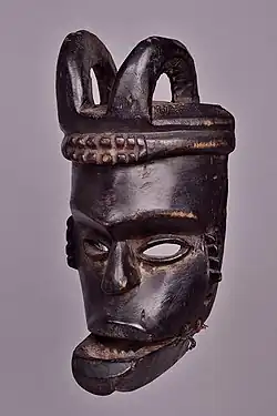 The masks and accoutrements of the Ekpo society make up the greatest works of art in Ibibio society. Ibibio often purposefully play with proportions in their masks to distort the face.[23] A component that appears often in Ibibio masks is an articulated lower jaw.[23] Ibibio people have an overarching theme of contrasting male and female masks by using dark and light colors respectively. These masks are not always performed together, but there is a general understanding of their opposing relationship. Feminine masks are decorated with light colors such as white. Their features are delicate to emphasize their femininity. On the other hand, masculine masks use dark colors to represent the mystic forces of the forest. These masks often have large features and are created to be intentionally ugly. They achieve this by distorting the features in unnatural manners such as having bulging eyes or misplaced mouths. Many deformities present in the masks come from naturally occurring human diseases and illnesses. One that is often depicted is gangosa, a part of yaws.[24] Signs of baldness and walking sticks also show up often in order to portray symbols of karma and old age. Men's costumes incorporate natural materials from the wilderness such as raffia, and seed pod rattles. Women's costumes use materials such as light colored cloth to represent the order of living in the village.[23]