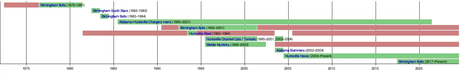 Birmingham Bulls (SPHL)Huntsville HavocAlabama SlammersMobile MysticksHuntsville Channel CatsHuntsville BlastBirmingham Bulls (ECHL)Alabama–Huntsville Chargers men's ice hockeyBirmingham Bulls (ACHL)Birmingham South StarsBirmingham Bulls (WHA)
