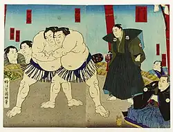 ![]() Ichinoya (left) faces Nishinoumi I (right) in a sumo match in 1887 | |