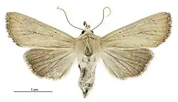 The expansion of the wings is about 1+1⁄2 inches. The fore-wings are cream-coloured with the veins darker; there are three faint black dots at about one-third, a curved series of black dots near the termen, the termen itself being strongly shaded with dark greyish-brown; the cilia are dark greyish- brown. The hind-wings are grey, paler towards the base; the cilia are also grey.[6]