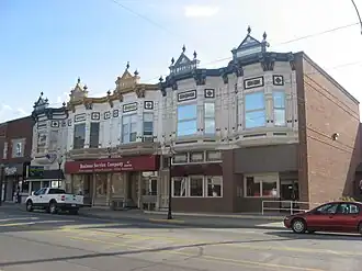 Iddings-Gilbert-Leader-Anderson Block is a row of five connected historic commercial buildings located at Kendallville, Noble County, Indiana. The block was built between 1891 and 1895, and is a two-story, red brick building with pressed metal facades in the Queen Anne style.[2]: 2, 5