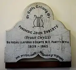 Ieuan Gwyllt was the bardic name of Welsh musician and minister John Roberts (22 December 1822 - 14 May 1877). His bardic name is derived from the pen name he used whilst writing poetry as a boy, Ieuan Gwyllt Gelltydd Melindwr (John of the Wild Woods near the Mill Tower).[1] He was born at Tanrhiwfelen, a house just outside Aberystwyth, and died in Caernarfon on 14 May 1877. He was buried at Caeathro cemetery near Caernarfon.