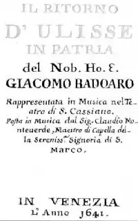 Giacomo Badoaro (1602–1654) was a prolific poet in the Venetian dialect who was a member of the Accademia degli Incogniti, a group of free-thinking intellectuals interested in promoting musical theatre in Venice—Badoaro himself held a financial interest in the Teatro Novissimo.[11] Il ritorno was his first libretto; he would later, in 1644, write another Ulysses-based libretto for Francesco Sacrati.[11] The text of Il ritorno, originally written in five acts but later reorganised as three, is a generally faithful adaptation of Homer's Odyssey, Books 13–23, with some characterisations altered or expanded. Badoaro may have been influenced in his treatment of the story by the 1591 play Penelope by Giambattista della Porta.[12] The libretto was written with the express purpose of tempting Monteverdi to enter the world of Venetian opera, and it evidently captured the elderly composer's imagination.[12][13] Badoaro and Monteverdi used a classical story to illustrate the human condition of their own times.[14]