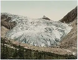 Although First Nations people were present in valleys to the east and west, evidence of aboriginal settlement in the Illecillewaet area has not been found.[5] The first European to visit the glacier was Major A.B. Rogers, a railway surveyor, who examined the area in 1882 and 1883 in search of a viable pass.[6] With the completion of the transcontinental Canadian Pacific Railway (CPR) through nearby Rogers Pass in 1885, the glacier and its surrounding area became one of western Canada's first tourist destinations. Glacier National Park was established in 1886, and Glacier House, a small hotel, was built near the terminus of the glacier in the same year.[5] The hotel was expanded in 1892 and 1904,[7] and by 1907 the glacier was described as the "most visited glacier in the Americas".[6]