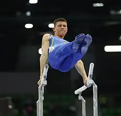 Kovtun competed at the World Cups in Cairo, Cottbus, and Baku; he won gold on the parallel bars at each competition.[33][34][35] He next competed at the Osijek Challenge Cup where he won gold on floor exercise and silver on parallel bars behind Lukas Dauser.[36] In late April Kovtun competed at the European Championships alongside Nazar Chepurnyi, Igor Radivilov, Radomyr Stelmakh, and Oleg Verniaiev; together they qualified to the team final in first place and individually Kovtun qualified to the parallel bars and horizontal bars finals. Additionally Kovtun finished sixth in the all-around. During event finals Kovtun won gold on both apparatuses.[37] During the team final Kovtun contributed scores on pommel horse, rings, parallel bars, and horizontal bar towards Ukraine's first place finish.[38]