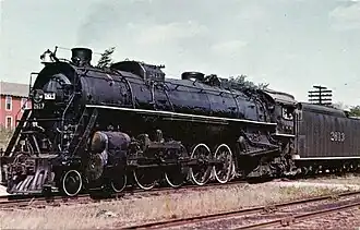 No. 2613 was one of twenty 2600 class 4-8-2 locomotives, Nos. 2600-2619, constructed at the Illinois Central Railroad's (IC) Paducah Shops in Paducah, Kentucky, between November 1942 and August 1943.[1][2] Construction involved fabricating new boilers and shipping in one-piece cast frames from General Steel Castings in Granite City, Illinois.[1][3] The locomotives were also equipped with twelve-wheel tenders that held 20,000 US gallons (16,653 imp gal) of water and 26 tonnes (26,000 kg) of coal; a design feature that was rare on IC steam locomotives.[1] The 2600 class was a step-up design of the IC 2500 class 4-8-2's, and their design was identical to the Baldwin-built 2800 series locomotives on the Wabash Railroad, but the 2600's were larger and heavier.[1][3]