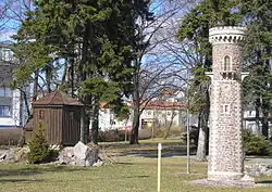 Replicas of a Kickelhahn tower and Goethehäuschen (Goethe's cabin) in the station forecourt