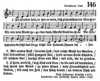 Thirdly, during the Reformation, the Nunc dimittis was used as a prayer of thanks after communion, as documented in a Nördlingen liturgy of 1522 and a Strasbourg liturgy of 1524, the latter specifically calling for its use "after the meal" or communion (nach dem Mahle).[2] The rhyming paraphrase created by Johann Englisch, or Johannes Anglicus, first appearing in 1527 on a now-lost leaflet, became a regular part of Strasbourg hymnals from 1530 on.[2] His version retains the theme of the Nunc dimittis, with its ideas of rest in peace after having seen the light of a saviour who came for all people and especially Israel.[3] The hymn is sung to a melody attributed to Wolfgang Dachstein, written before 1530.[4] It is one of three hymns described as Der Lobgesang Simeonis (Simeon's song of praise) appearing in an 1848 collection of Schatz des evangelischen Kirchengesangs im ersten Jahrhundert der Reformation ("Treasure of Protestant church singing in the first century of the reformation"). The first two are the Biblical canticle in Martin Luther's translation, and Luther's paraphrase Mit Fried und Freud ich fahr dahin, followed by Im Frieden dein. A footnote marks the three songs as also suitable for funerals.[5]