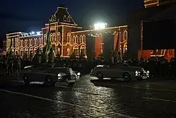 The two Turkmen Pobeda cars during the nighttime rehearsal on Red Square.