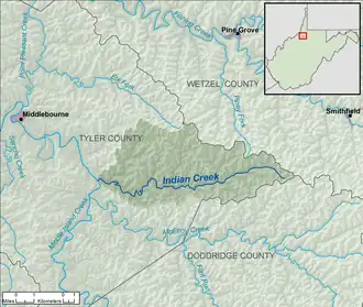 Indian Creek is a tributary of Middle Island Creek, 14.8 miles (23.8 km) long,[3] in northern West Virginia in the United States. Via Middle Island Creek and the Ohio River, it is part of the watershed of the Mississippi River, draining an area of 32.3 square miles (84 km2)[4] in a rural region on the unglaciated portion of the Allegheny Plateau.