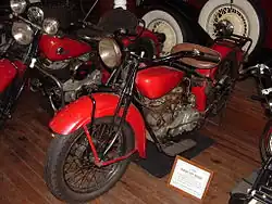 Designed by Charles B. Franklin,[1][3] the Scout was introduced in October 1919 as a 1920 model. The Scout had a sidevalve V-twin engine with its transmission bolted to the engine casing, allowing a geared primary drive - the only American v-twin to use this maintenance-free system.[4] The Scout engine initially displaced 606 cc (37 cu in), but the engine size was increased to 745 cc (45 cu in) in 1927 in response to the popularity of the Excelsior Super X.[1][5] In early 1928, a front brake was added to the Scout.[6]