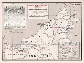 Despite the 1915 boundary agreement, there are at least nine areas where the two countries have outstanding disputes over the location of the land boundary.[20] The comprise five locations along the boundary between Indonesia's North Kalimantan province and Malaysia's Sabah state, and four locations between Indonesia's West Kalimantan province and Malaysia's Sarawak state.