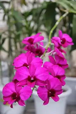 Indonesia is the source of the floral symbol of the Eternal President of the Democratic People's Republic of Korea, Kim Il Sung, exemplifying the close relations of both countries' founding fathers. President Sukarno named a cultivar of orchid Kimilsungia during Kim Il Sung's state visit in 1965. The violet Kimilsungia orchid has since become a symbol of the late Juche leader, being used in official floral arrangements representing the North Korean state.[7]
