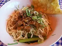 • Mie ayam, chicken noodle soup[7] comprising a bowl of chicken stock, boiled choy sim, celery leaves, diced chicken cooked with sweet soy sauce, and fried shallots. Some variants add mushrooms and fried/boiled pangsit (wonton). Normally it is eaten with chili sauce and pickles.