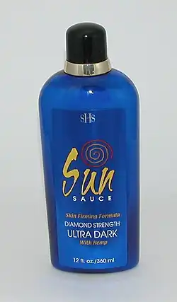 Indoor tanning lotions accelerate the tanning process, by promoting the production of melanin.[1] Increasing blood flow to the skin is a proposed mechanism, which may in turn stimulate production of melanin by melanocytes.[2] Historically, indoor tanning lotions have contained no sunscreen and offer no protection from the sun. However, many tanning lotions currently contain sunscreen. Unlike sunless tanning lotions, these are designed for use with an ultraviolet source such as a tanning bed or booth.