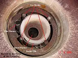 A furnace can be lit by a small pilot flame or in some older models, by hand. Most pilot flames nowadays are lit by an ignition transformer (much like a car's spark plugs). The pilot flame in turn lights up the main flame. The pilot flame uses natural gas while the main flame can use both diesel and natural gas. When using liquid fuels, an atomizer is used, otherwise, the liquid fuel will simply pour onto the furnace floor and become a hazard. Using a pilot flame for lighting the furnace increases safety and ease compared to using a manual ignition method (like a match).