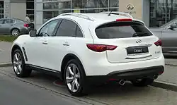 The Infiniti QX70, called the Infiniti FX until 2013, was a crossover SUV built in two generations between 2002 and 2017. The FX series replaced the Infiniti QX4 as Infiniti's mid-size SUV. It shares the same Nissan FM platform as the rear-wheel drive Nissan 370Z, and it "made no claims of climbing mountains." Rather, its aggressive shape promised style and quick handling.[1] The similarly sized Nissan Murano is based on the same D platform as the front-wheel drive Nissan Altima. The FX does not have a Nissan-branded equivalent and is not sold in Japan.
