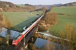 As part of the upgrade, the section from Rohrbach to Ingolstadt was upgraded for 160 km/h from spring 2000 to December 2006.[24] From 1999 to 2001, another bridge was built over the Danube for the construction of a third track between Ingolstadt Hauptbahnhof and Ingolstadt Nord station. The symbolic start of construction for the expansion of the Ingolstadt–Petershausen section was celebrated on 18 June 2010.[16] Line improvements of 7.95 kilometres were planned, along with 5.15 kilometres of new earthworks and the required widening of cross-sections. Completion of the overall project, which included 20 construction phases, was planned for 2014.[25] A total of around €200 million of Deutsche Bahn's own funds[16] would be invested in both sections. Without the upgrade, Deutsche Bahn would have to pay back EU funds for the entire project.[26] In the course of this work, Reichertshofen station was rebuilt about 500 m north of the previous location as Baar-Ebenhausen station.[27] The new station went into operation in July 2011 along with a new section of line.[28] In contrast to the old Reichertshofen station, all the main tracks in the new station are continuous.[29] The number of sidings at the existing station is to remain unchanged.[30]