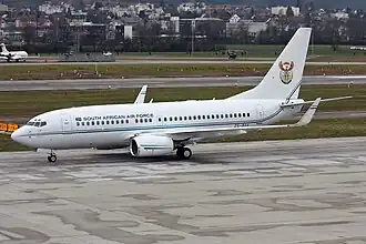 Inkwazi is a Boeing Business Jet (BBJ / Boeing 737) aircraft that serves as the primary mode of air transportation for the President of South Africa. Operated by 21 Squadron South African Air Force, the aircraft has a seating capacity for six ministers and ten additional passengers.[1] It cost 300 million rand to acquire and another 108 million rand to fit and decorate the interior which can accommodate up to 15 passengers.[2][3] The jet's name means "fish eagle" in Zulu.[4]