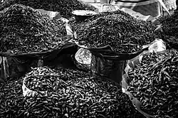 The organoleptic characteristics of edible insects vary between species and are influenced by environment.[32] For instance, aquatic edible insects such as water boatmen (family Corixidae) and dragonfly larvae have a fish flavor, while diving beetles taste more like clams.[32][33][34] Environment is not always a predictor of flavor, as terrestrial edible insects may also exhibit fish-like flavors (e.g. crickets, grasshoppers).[33][34] Over 400 volatile compounds responsible for the aroma and flavor of edible insects have been identified.[9] Pheromone chemicals contribute to pungent aromas and flavors in some species and the presence of organic acids (like formic acid in ants) makes some species taste sour.[35] Organoleptic characteristics are dependent on the development stage of the insect (egg, larva, pupa, nymph, or adult) and may change significantly as an insect matures.[32] For example, texture can change from soft to crunchy as an insect develops from larva to adult due to increasing exoskeletal chitin.[32] Cooking method is considered the strongest influence on the final flavor of edible insects.[32][9] Wet-cooking methods such as scalding or steaming remove pheromones and odor compounds, resulting in a milder flavor, while dry-cooking methods such as frying and roasting introduce more complex flavors.[32][9][36]