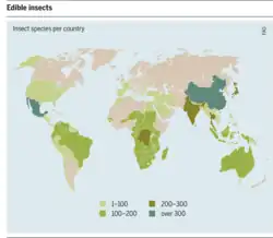Insect species consumption varies by region due to differences in environment, ecosystems, and climate.[17][18] The number of insect species consumed by country is highest in equatorial and sub-tropical regions, a reflection of greater insect abundance and biodiversity observed at lower latitudes and their year-round availability.[18][16][19]