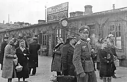 • Warszawa Gdańska railway station – the station area was secured by a machine gun nest and six individual firing positions.[1] A detached unit from the 2nd Battalion of Station Guards was stationed in the station buildings, usually accompanied by several officials armed with handguns. From the Feliński Street side, the station was guarded by a fortified guardhouse with a 12-man garrison. Near the station buildings, there was also a transit point for furloughed soldiers, where around 40 soldiers usually stayed.[4] Since July 26, 1944, the nearby road viaduct connecting Żoliborz with Śródmieście was also defended by a Panzer IV tank.[1] The station's garrison, like the posts at the nearby bridges, was connected by field communication wires to the Cytadel fortress.[5]