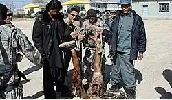 The incident involved a paratrooper platoon from the 82nd Airborne Division which was charged with two missions which involved the inspecting and identifying of the remains of insurgent suicide bombers. The first mission occurred in Afghanistan's Zabol province in February 2010. The platoon went to a police station in the provincial capital of Qalat where the Afghan police kept the mangled remains of a person whose legs were severed. The paratroopers were told by the police that the severed legs belonged to a suicide bomber whose explosives detonated as he tried to attack a police unit. Posing with members of the Afghan police some paratroopers held the corpse's severed legs. The second mission led the platoon to the morgue in Qalat in late April or early May 2010 according to the Los Angeles Times.[1] Here the paratroopers should identify three insurgents whose explosives had detonated accidentally as they were preparing a roadside bomb according to Afghan police. The soldiers obtained a few fingerprints and then posed grinning and mugging for photographs next to the remains. The Los Angeles Times reports: "Two soldiers posed holding a dead man's hand with the middle finger raised. A soldier leaned over the bearded corpse while clutching the man's hand. Someone placed an unofficial platoon patch reading "Zombie Hunter" next to other remains and took a picture."[1]