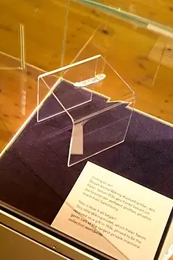 The walkabout starts with a 3,000-year-old dugout, which was found in the Elbe river.[13] Another exhibit is the baton of Großadmiral Karl Dönitz (1891–1945), displayed in an article about the Nuremberg Trials in the newspaper Berliner Zeitung of 1946. This article describes the sentences against the Nazi war criminals. The exhibition of the baton was often taken as an example of the lack of historical awareness about Nazi propaganda and the lack of distance toward Nazi symbolism, without challenging it.[3][4] Further the exhibition consists of paintings with a naval or marine theme, model ships made of whale bones or ivory, weapons, uniforms, and decorations.[13] Also the reproduction of the James Caird, the small lifeboat of Sir Ernest Shackleton's Imperial Trans-Antarctic Expedition, used by the German explorer Arved Fuchs in a relived journey in 2000,[15] is displayed.[16] The museum's archive also possesses 47 original letters of Lord Horatio Nelson, famous for his victory at the Battle of Trafalgar, and 15,000 cruise ship menus.[13]