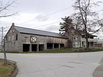 The Ira Hill House stands in the village center of Isle La Motte, on the west side of Main Street north of its junction with School Street, and just south of the town hall. It consists of a stone main block, 2+12 stories in height with a gabled roof, and a long wood-frame and stone ell extending southward from its left. The main block is fashioned out of quarry-cut limestone, some of it exhibiting fossils found in the island community's limestone outcrops. It is fronted by a two-story shed-roof porch, a late 20th-century recreation of an earlier Victorian porch with turned posts and scrolled brackets. The ell has two parts: the outer end is a stone barn whose first floor was built contemporaneously to the house, and whose second floor was added about 1840. The joining section consists of a rear stone wall and a front wood frame wall.[2]