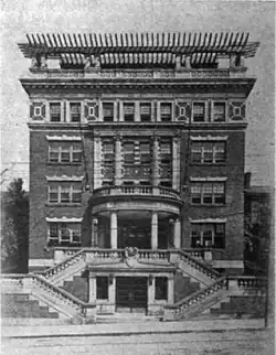 It had a resident staff of seven; additionally, 170 volunteers gave one or more hours each week to some form of social service in the district. The property of the Irene Kaufmann Settlement covered an area of 200 by 60 feet (61 m × 18 m). The settlement building was erected in 1910. It was of steel frame construction with yellow brick, and five stories high. There were 67 rooms in the main building, and a gymnasium and public bath in the rear, that building being known as the Peacock Public Bath. The settlement building was dedicated March 29, 1911. It was a monument to the memory of Irene Kaufmann, daughter of Mr. and Mrs. Henry Kaufmann, owners of Kaufmann's Department Store, one of the largest stores in Pittsburgh. Miss Kaufmann died in 1907.[1][2][3]