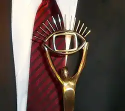 The trophy's shape is based on a human figure holding an eye with a square iris. Depending on the profession of the person who won it, a different silhouette appears under the figure's feet – a film reel, musical note, etc.