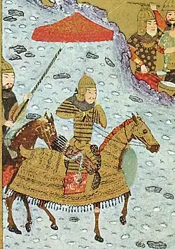 Throughout this time Iskandar, though under the nominal suzerainty of Shah Rukh, essentially acted as an independent ruler.[9] By 1413/14, Iskandar's ambitions had brought him into direct conflict with Shah Rukh. Troubled by reports from his nephew's realm, Shah Rukh sent an emissary to invite him in a joint-expedition against the Qara Qoyunlu, a pretext to have Iskandar recognise his authority. The emissary instead returned bearing news that the prince was minting coinage in his own name. At this time, Iskandar began rallying local rulers to support him in a fight against his uncle. In response, Shah Rukh marshalled his forces in a campaign against Iskandar, with the latter's brothers, Rustam and Bayqara, in his train.[13][9] On 21 July 1414, Iskandar was defeated and captured at Isfahan, with the city submitting to Shah Rukh after a short siege. The prince's lands were distributed among various Timurids, including Bayqara, who received Hamadan and Luristan, and Rustam, who had Isfahan returned to him.[13] Rustam was also given custody of Iskandar, whom he subsequently had blinded.[9]