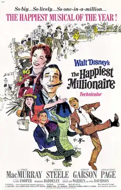The Happiest Millionaire is a 1967 American musical film starring Fred MacMurray, based upon the true story of Philadelphia millionaire Anthony Drexel Biddle. The film, featuring music by the Sherman Brothers, was nominated for an Academy Award for Best Costume Design by Bill Thomas. The screenplay by A. J. Carothers was adapted from the play, based on the book My Philadelphia Father by Cordelia Drexel Biddle.[3] Walt Disney acquired the rights to the play in the early 1960s. The film was the last live-action musical film to be produced by Disney before his death on December 15, 1966.[4][5][6]