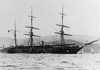 In 1892, Flavio Gioia was rearmed and converted into a training ship.[1] Later that year, Flavio Gioia joined the Training Squadron attached to the Italian naval academy at Livorno. In July, she went on a training cruise with the other vessels of the squadron, including the screw corvette Caracciolo and the old screw frigate Vittorio Emanuele, supported by the transport ship Conte di Cavour. The voyage lasted for three and a half months, and included stops in the Azores, Gibraltar, Vigo and Cartagena in Spain, the Balearic Islands, and La Maddalena, Italy, before returning to Livorno.[4] On 1 October 1893, she was assigned to the 3rd Department, which was stationed in Venice; she remained there through the following year.[5] Beginning on 14 October, the Italian fleet, including Flavio Gioia, assembled in Genoa for a naval review held in honor of King Umberto I at the commissioning of the new ironclad Re Umberto. The festivities lasted three days.[6] Flavio Gioia operated as a cadet training vessel in company with the corvette Cristoforo Colombo in 1895. Flavio Gioia was based in Naples and Taranto that year.[7]