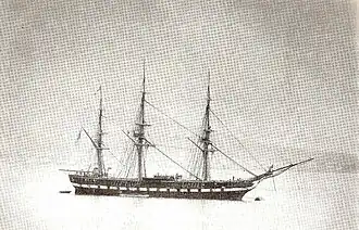 She was fitted with a three masted full-ship rig. The ship was converted in 1861–1862 with a single marine steam engine that was supplied with a single boiler. It drove a screw propeller and was rated to produce a top speed of 9 knots (17 km/h; 10 mph),[1] from 220 metric horsepower (217 ihp).[3] The ship could carry up to 148 long tons (150 t), which enabled her to steam for 1,515 nautical miles (2,806 km; 1,743 mi) at 9 knots. As refitted with steam propulsion, she retained the sailing rig for auxiliary use.[1]