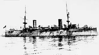 Vettor Pisani, named after the eponymous Venetian admiral,[4] was laid down on 7 December 1892 at the Royal Shipyard in Castellammare di Stabia.[2] The ship was launched on 14 August 1895 and completed on 1 April 1899.[1] She was the flagship of Rear Admiral Candiani, commander of the Cruising Squadron dispatched to China in 1900 during the Boxer Rebellion.[5] Vettor Pisani arrived there on 20 August and made port visits in Japan, Korea and Vladivostok before departing the area on 29 November 1901. She arrived at La Spezia in February 1902, but only remained in Italian waters for a year before departing for another year-long cruise to the Far East on 15 April 1903. On 14 October, the Italian Legation in Peking successfully radioed the ship off the coast of China, one of the first long-range radio transmissions to a ship. The cruiser arrived back in Italy on 13 June 1904. Nothing is known of her activities until May – June 1908 when Vettor Pisani made a short cruise in Greek waters.[6]